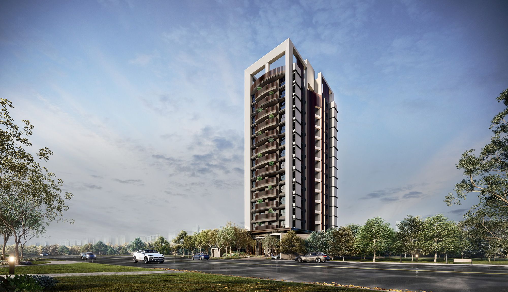 懂得謙退,融景街廓綠化景觀, 現代主義風格,水亚委直俐落大器線條, 灰色系深淺交織雙色框架式立面, 呈現蜃欠名戀的細緻紋理與量體變化忤, 曲線陽台律動迎景,格柵點綴豐富視覺美感 令人驚艷都會休閒建築風景,擘劃森境天際線